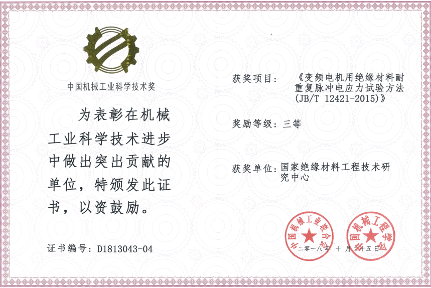由中國機械工業聯合會和中國機械工程學會共同設立“中國機械工業科學技術獎”,是中國機械領域最具權威的獎項之一。近日,2018年度中國機械工業科學技術獎獲獎項目公布,我公司(國家絕緣材料工程技術研究中心)參與制定的行業標準JB/T12421-2015《變頻電機用絕緣材料耐重復脈沖電應力試驗方法》榮獲 “中國機械工業科學技術獎” 三等獎。此次獲獎說明公司一如既往的發揮著行業示范帶頭作用,爭先擁有規則的話語權,為公司提高核心競爭力和產品創新能力提供了助力。
