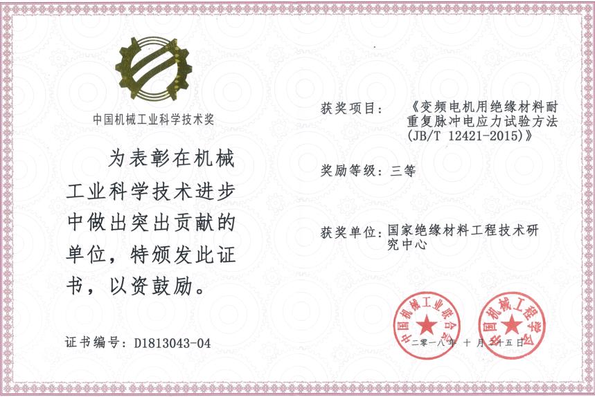 由中國機械工業聯合會和中國機械工程學會共同設立“中國機械工業科學技術獎”,是中國機械領域最具權威的獎項之一。近日,2018年度中國機械工業科學技術獎獲獎項目公布,我公司(國家絕緣材料工程技術研究中心)參與制定的行業標準JB/T12421-2015《變頻電機用絕緣材料耐重復脈沖電應力試驗方法》榮獲 ...