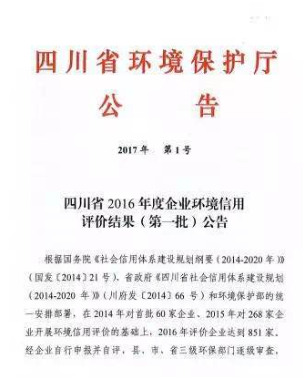7月21日,四川省環(huán)境保護(hù)廳發(fā)布2017年第1號公告,公布了2016年度第一批企業(yè)環(huán)境信用評價結(jié)果。在全省申報的851家企業(yè)中,包括四川東材科技集團(tuán)股份有限公司在內(nèi)的29家企業(yè)獲得四川省2016年度“環(huán)境誠信企業(yè)”稱號。 據(jù)環(huán)保廳政策法規(guī)處介紹,“環(huán)保誠信企業(yè)”的評...
